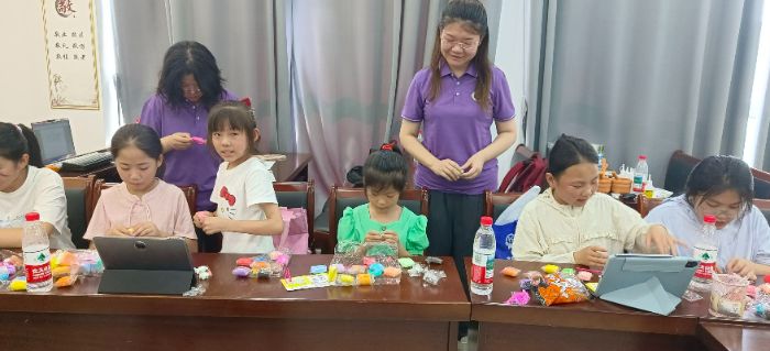 (圖為7月14日,“情系鹽城鄉(xiāng)村 愛撒支教課堂”團(tuán)隊(duì)成員協(xié)助孩子們進(jìn)行積木和粘土制作。指導(dǎo)老師霍藝供圖)