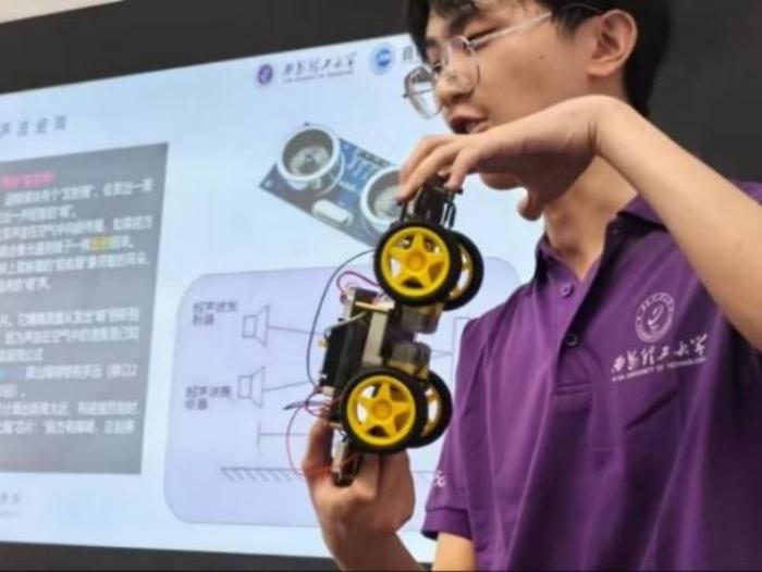 “科技是鄉村振興的強勁引擎。”智能小車主講人李連成以趣味問題“小車如何‘看懂’路線”開篇。他選取循跡模塊、超聲波避障兩大核心點,以初中反射知識為基礎,通過類比和實物演示讓抽象知識變生動。當抽象的公式變成小車靈活避障的身影,知識便有了沉甸甸的力量,在他們