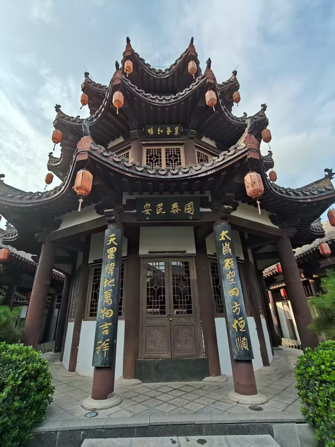 踏入隋唐大運河文化片區,首遇**“國泰民安”樓閣**。飛檐如翼,層層遞升,榫卯結構的精巧在光影中盡顯。梁柱間,“天罡覆地萬物吉祥,太陰垂空四方恒順”的楹聯古樸厚重,墨色里藏著運河水運的千年祈愿。