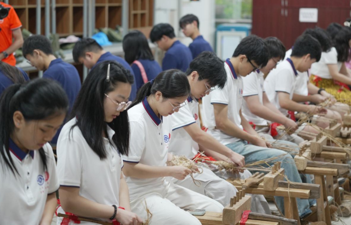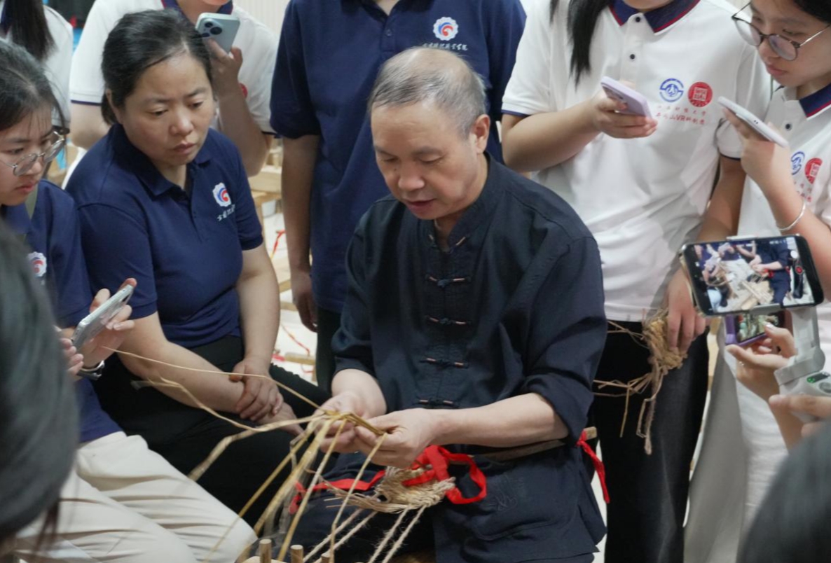 一切準(zhǔn)備就緒,專業(yè)師傅隨即登臺(tái)示范,現(xiàn)場(chǎng)教學(xué)開始。師傅手法嫻熟,邊操作邊講解,教學(xué)結(jié)束,同學(xué)們迅速投入實(shí)踐,指尖麻繩翻飛,稻草交織,在經(jīng)緯穿梭中,革命記憶得以重現(xiàn),“江山就是人民”的深刻內(nèi)涵化作指尖的溫?zé)崤c心中的共鳴。