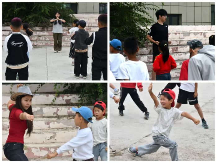 運動場中央,學生們緊盯康老師的五步拳示范——馬步沖拳虎虎生風,歇步亮掌穩若磐石。作為中華武術的基礎拳術,五步拳被納入中南大學大一必學項目。支教團緊密結合在校所學知識,幫助學生掌握五步拳的基本手型、步型與發力技巧,在協調統一的配合中培養團隊意識,在專注力與意志力的淬煉中傳承中華民族優秀傳統文化。在教學中,孩子們問“老師,回湖南還能視頻檢查功課嗎?”,這讓康老師在課后感慨:“我們播下的不僅是運動種子,更是連接湘疆的文化紐帶。”。最后,眾人齊打五步拳,即使動作沒有做到最精準、最好看,但中華武術的剛柔并濟深深烙印在孩子們心中。