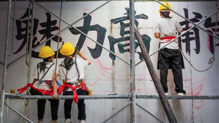 圖為團隊成員在河源高埔崗街道繪制墻繪。徐浩 供圖