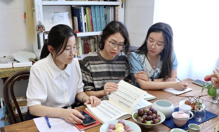 圖為團隊成員在吳心悅老師的指導下學習了解昆曲唱詞 鄧之汐供圖