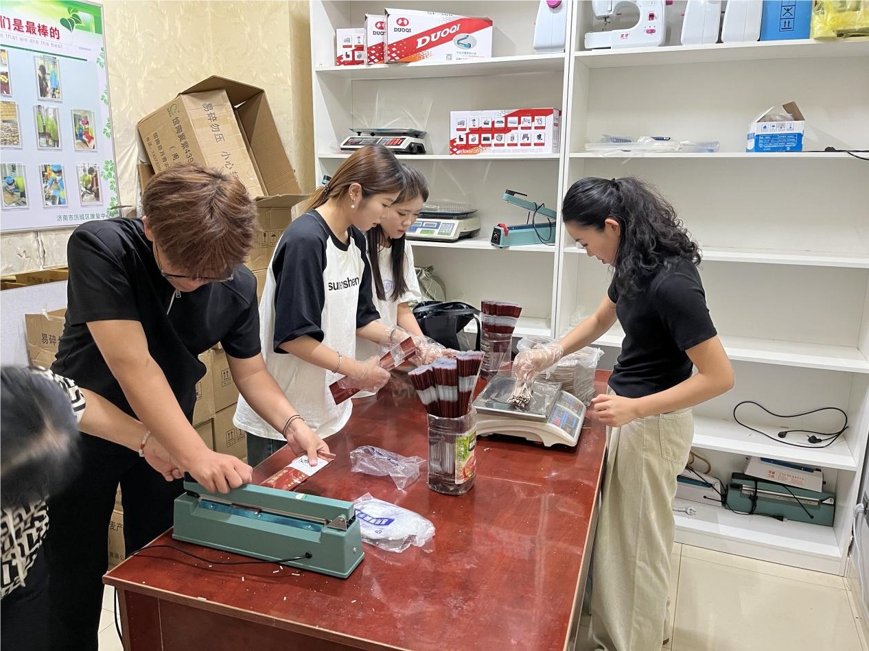 在包裝面條工作臺(tái),實(shí)踐團(tuán)成員迅速融入與殘疾人士一起操作封口機(jī)、清點(diǎn)物品、打包成品。