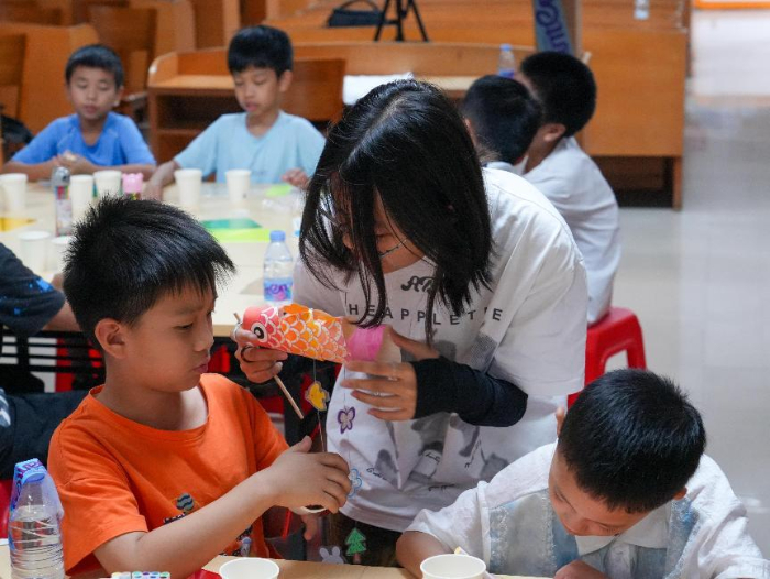 二、巧手匠心:魚燈手工制作課 在非遺魚燈手工制作課上,孩子們化身“小匠人”,在支教老師的指導下體驗傳統技藝的魅力。彎折竹篾作骨,粘貼彩紙為身,細心描繪鱗片,一盞盞象征吉祥的錦鯉魚燈在稚嫩的手中逐漸成型。