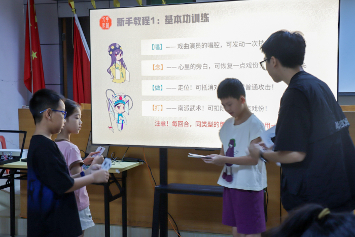 三、粵聚游戲:趣味粵劇體驗課 如何讓傳統粵劇走進孩子們的心里?“鄉粵此刻”支教老師將團隊自主研發的粵劇桌游與多模態廣府非遺美育教具帶入課堂,化繁為簡,設計出趣味盎然的粵劇小游戲,讓孩子們在玩樂中輕松學習。課堂化身歡樂舞臺,傳統藝術如會發光的玩伴,與孩子們躍動嬉鬧,在驚喜歡笑中相擁。