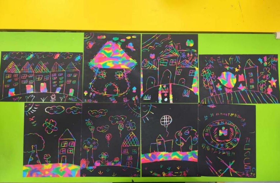 圖為刮畫成品 靜思與探索:閱讀區里,小朋友們專注聆聽志愿者講解童話繪本,好奇地詢問“后來呢?”“后來呢?”;五子棋桌上,小朋友與志愿者仔細思考,緩下棋子。