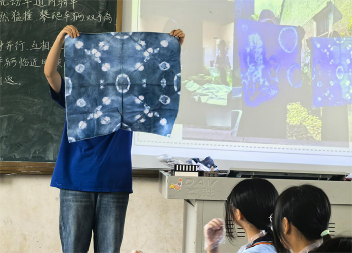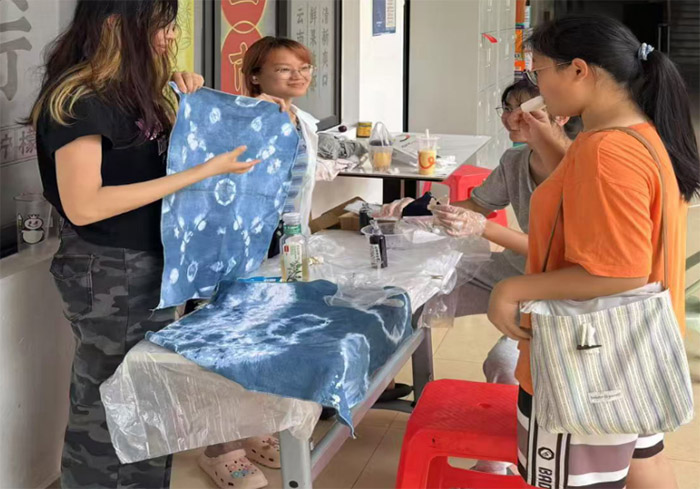 在鄉村振興和“百縣千鎮萬村高質量發展”工程視域下,以實現河源藍染傳統技藝的活態延續為目的,2025年4月至8月,指導教師廣東技術師范大學美術學院趙婷婷、鹿新杰,帶領全體大創團隊成員鐘嘉恩、民族學院龐佩容、數學與系統科學學院李淑銀、文學與傳媒學院詹佩蕓,和研究生黃春涌、王子怡一起展開《大美仙塘,炫彩扎染—做非遺文化的傳承者》項目,從河源仙塘南園古村的幻藍古染工坊,到廣東技術師范大學的學生活動中心,再到梅州五華縣歧嶺鎮華源小學的課堂,人們在實踐中了解藍染的奧秘和趣味,體驗客家傳統的質樸和智慧,實現“讓傳統技藝活在當下”。