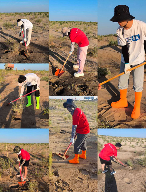 在種林基地,隊員們迅速投入梭梭樹維護的實踐勞作。他們頭頂烈日,嚴格遵循技術規范,一絲不茍地進行澆水、回填、管護等工序。面對沙地高溫和體力消耗,隊員們發揚吃苦耐勞精神,日均在沙區作業近5小時,以實際行動呵護每一株梭梭幼苗,為筑牢生態屏障貢獻力量。