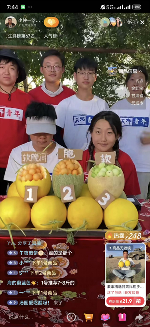 科技助農,直播帶貨拓銷路。7月28日下午,實踐隊利用電商優勢,在收成鎮駐地臨時搭建簡易直播間,開展“為民勤蜜瓜代言”助農直播活動。隊員們化身帶貨主播,熱情介紹民勤蜜瓜的優良品質、種植環境及生態價值,吸引了80余名網友在線觀看互動。直播反響熱烈,成功售出民勤蜜瓜300余箱,有效拓寬了當地特色農產品的線上銷售渠道,以實際行動助力農戶增收,踐行了“助農興農”的實踐承諾。