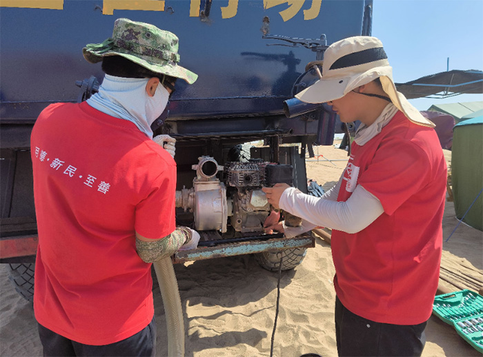 專業賦能,應急維修保灌溉。7月29日清晨,基地用于梭梭林灌溉的關鍵設備抽水泵設備需要安裝在灑水車上。聞此要求,實踐團隊中機電專業的隊員迅速響應,利用所學專業知識與技能,現場對設備進行檢查,高效協同,成功安裝了抽水機器,確保了灌溉系統的及時恢復和正常運行,保障了基地治沙造林工作的順利推進,充分展現了學以致用、服務基層的專業素養和實干精神。