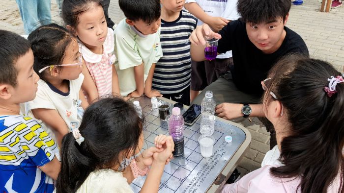 同一時間,南湖公園的實踐現場同樣熱鬧非凡。科學實驗臺前圍坐著一群眼睛發亮的小朋友,實踐隊員們變魔術般地展示著健康科學小實驗。"看好了,見證奇跡的時刻到啦!"隨著隊員將維生素C倒入棕黃色的碘伏溶液,液體就像被施了魔法般漸漸變得透明。"這就像我們身體里的小衛士在工作,"隊員蹲下身來,用孩子們能理解的語言解釋,"它們每天都在把對身體不好的東西變成好東西。"