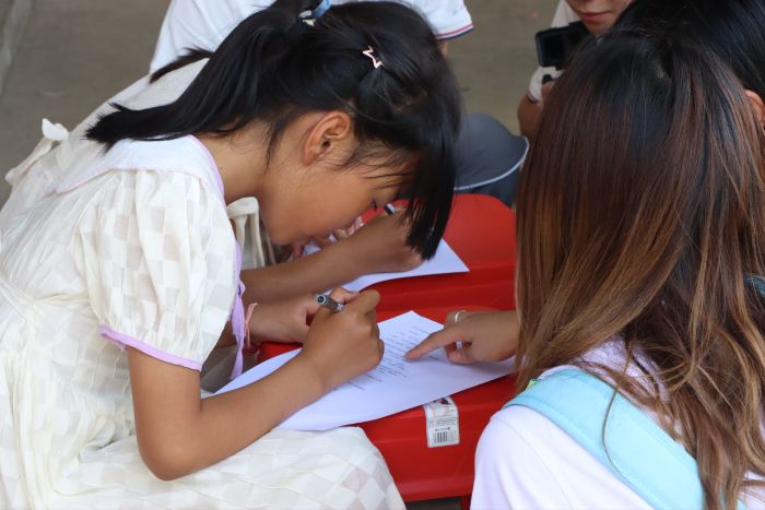 (圖為實踐隊指導小朋友填寫調查問卷的場景。勾興敏供圖)