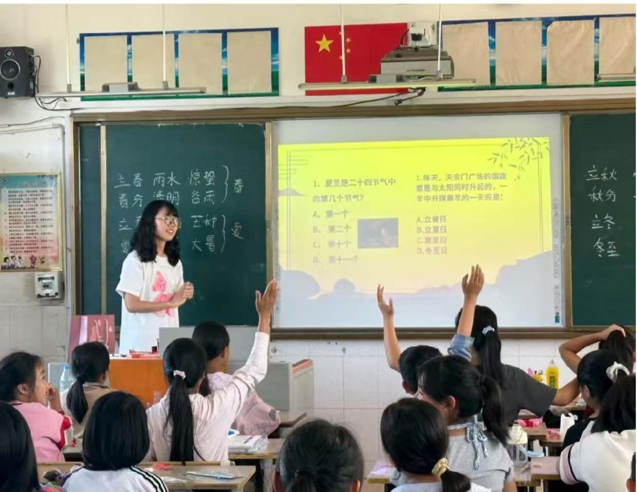 宜良的活動以“民俗與經典交融”為核心,讓青少年在沉浸式體驗中觸摸文化溫度。志愿者們首先邀請當地非遺傳承人帶領學生學跳彝族舞蹈,孩子們跟著明快的節奏,擺動著象征豐收的手勢,在旋轉跳躍中感受彝族“火把節”所傳遞的熱情與團結。“春分麥起身,一刻值千金”,在“二十四節氣課堂”上,志愿者通過動畫短片解析節氣與農耕、生活的關聯:從清明掃墓祭祖的孝道傳承,到冬至吃湯圓的團圓寓意,一個個生動案例讓抽象的時間智慧變得可知可感。詩歌鑒賞環節更成了“文化加油站”,志愿者以李白的《靜夜思》為引,講解“月亮意象”的思鄉內涵,隨后鼓勵孩子們提筆創作,稚嫩的詩句里,藏著傳統文化浸潤的詩意。此外,“全球文化多樣性”分享課上,志愿者對比彝族刺繡與墨西哥刺繡的異同,引導學生理解“各美其美,美美與共”的包容理念。
