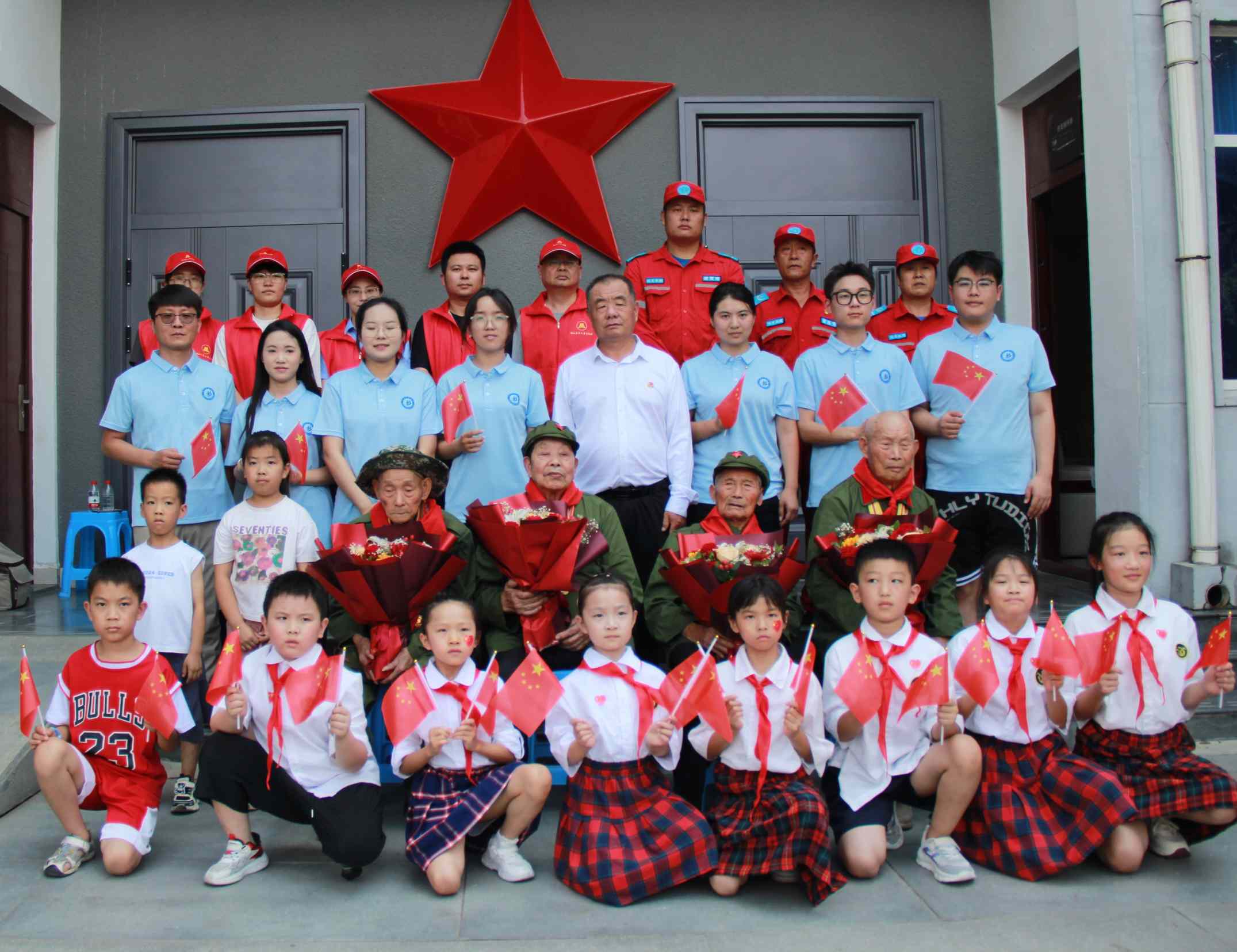 圖為實踐團與袁國章、李明臣、藏海龍、張富起四位老兵,蛟龍救援隊隊員和少先隊員合影,彰顯老中青少四代人的紅色傳承。楊濤 供圖