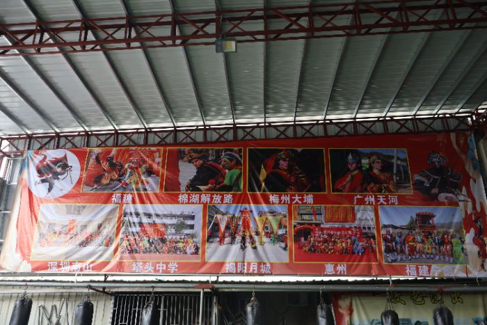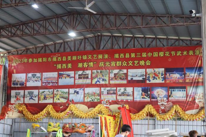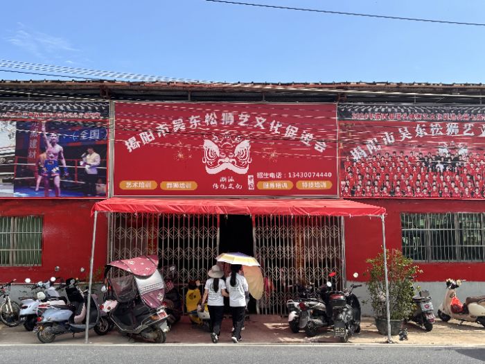 在塔頭鎮的街道旁,紅墻亮眼的“揭陽市吳東松獅藝文化促進會”,是潮汕非遺傳承的一方熱血陣地。這里,藏著老板吳東松對英歌舞、獅藝的執著堅守。從熱愛出發,這里不僅是英歌舞、武術、舞獅的傳習所,更承載著潮汕人對非遺文化的深情。紅墻之上,武術、英歌舞的宣傳畫,訴說著傳承的故事,吸引著一批又一批熱愛傳統文化的人,在守護非遺的路上并肩前行。