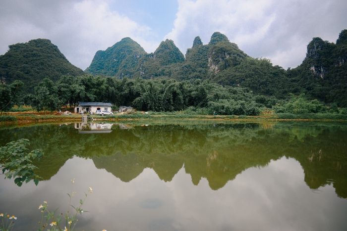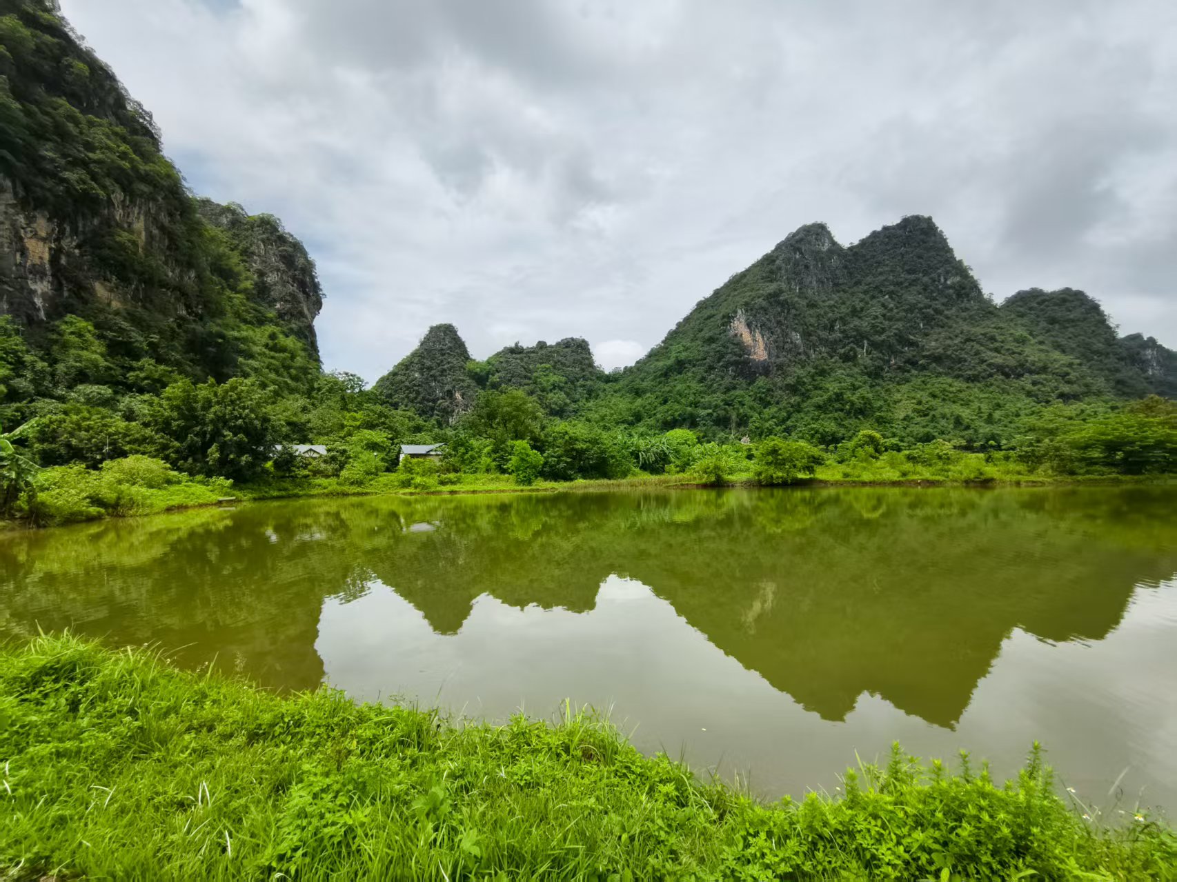 突擊隊首站抵達寨背峰林核心景觀“阡陌蕓薹”。盛夏時節,荷塘清香四溢,與碧綠湖面交相輝映。成員們觀察到,形態各異的峰林倒映于如鏡湖水中,構成一幅立體的山水畫卷。湖面游鴨劃破寧靜,波紋蕩漾間盡顯自然靈動之美。此處獨特的“峰林-荷塘-倒影”景觀層次,成為團隊重點記錄的視覺素材。