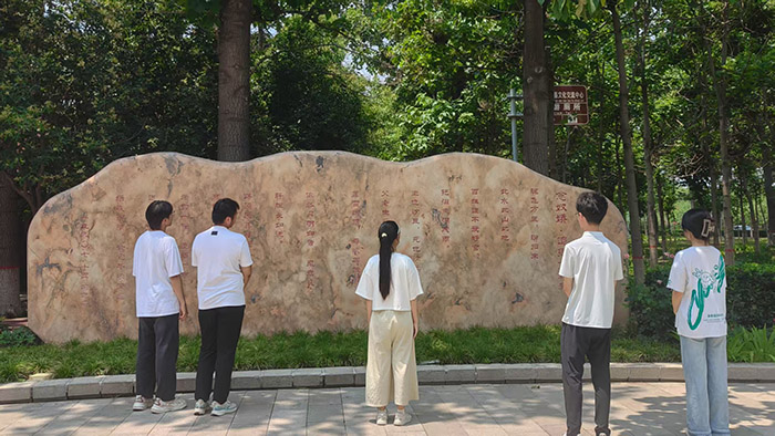 焦桐寄思:在綠色傳承中踐行專業使命 最后一站,來到了焦裕祿同志親手栽植的焦桐樹下。歷經數十年風霜,這棵參天大樹早已枝繁葉茂,其偉岸的身姿不僅是蘭考大地的綠色豐碑,更是這片土地上不屈奮斗的精神圖騰。實踐隊成員們肅然圍聚,手捧《念奴嬌·追思焦裕祿》,齊聲誦讀:“百姓誰不愛好官?把淚焦桐成雨……”深情的吟誦在林間回蕩,交織著對先輩的無盡追思與對“時代傳承”的深切叩問。