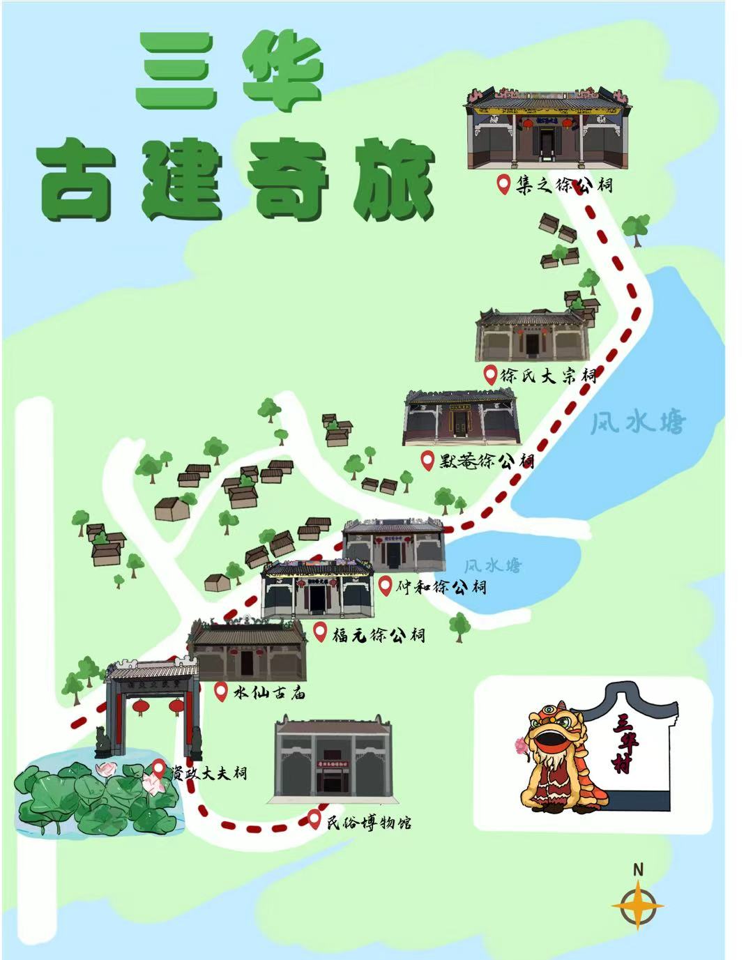 為打造受年輕受眾喜愛的集章打卡旅游路線,實踐團成員連續一周在三華村多次進行實地考察,詳細記錄村風村貌與景點位置,最終設計出了以“三華古建奇旅”為主題的手繪地圖,涵蓋“民俗博物館-資政大夫祠-水仙古廟-福元徐公祠-仲和徐公祠-默庵徐公祠-徐氏大宗祠-集之徐公祠”等景點,風格卡通清新,兼具地域性、標志性和故事性,得到三華村團委書記李嘉茵的高度認可。