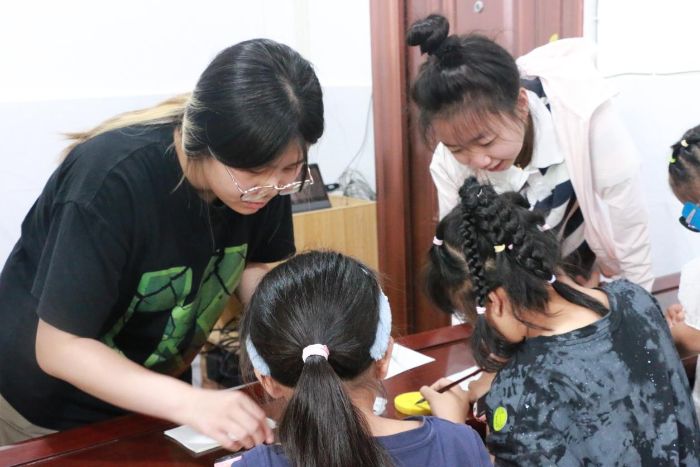 實(shí)踐團(tuán)成員在指導(dǎo)小朋友們畫畫攝|沈羽雪