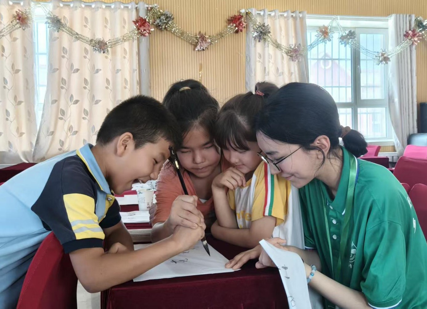 第二部分是團隊成員從握筆姿勢教起,手把手指導孩子們臨摹簡單漢字。墨香裊裊中,孩子們一筆一畫認真書寫,不時舉手請教。通過筆墨互動,為鄉村孩子帶來陪伴與關懷,豐富精神文化生活,在他們心中播下對傳統文化熱愛的種子。
