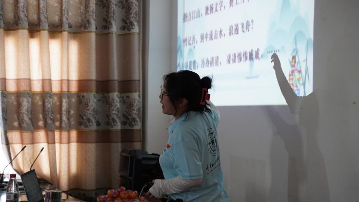 圖為實踐團成員在支教班上朗誦課、黃艷林攝
