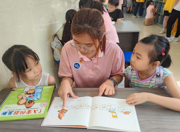 活動分為閱讀引導和創意書簽制作兩個環節。在閱讀引導環節,隊員們根據孩子們的年齡分組,為低年級學生聲情并茂地講述繪本故事。高年級學生則自主閱讀文學作品,與隊員們深入交流書中情節,分享閱讀心得,現場書香彌漫,氛圍熱烈。