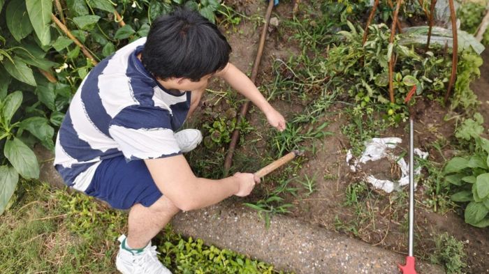 圖為實踐團隊成員在田間手工除草 張潤豪供圖