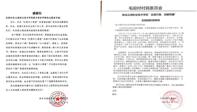 為深入貫徹國家通用語言文字推廣政策,鑄牢中華民族共同體意識(shí),連云港職業(yè)技術(shù)學(xué)院“言通萬里、語暖西疆”西藏、新疆地區(qū)推廣普通話實(shí)踐團(tuán)暑期奔赴西藏、新疆多地,開展普通話推廣實(shí)踐活動(dòng)。團(tuán)隊(duì)深入基層社區(qū)、牧區(qū)及鄉(xiāng)村,通過政策宣講、文化互動(dòng)、需求調(diào)研等形式,架起語言溝通橋梁,助力民族團(tuán)結(jié)與鄉(xiāng)村振興。活動(dòng)覆蓋西藏拉薩、那曲、昌都、日喀則及新疆阿克蘇等地,惠及千余名群眾,并獲當(dāng)?shù)卣叨日J(rèn)可,最后收到的兩封感謝信成為實(shí)踐成效的生動(dòng)腳注。