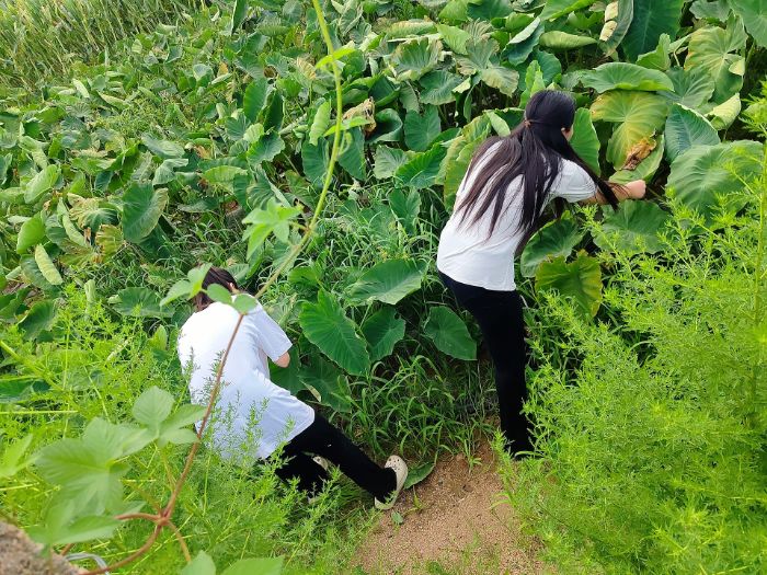 第二站,團(tuán)隊(duì)成員來到了鄌郚鎮(zhèn)洛村。時值夏季,洛村的田野間的作物都在蓬勃成長,構(gòu)成了一幅生機(jī)勃勃的畫卷。團(tuán)隊(duì)成員走進(jìn)農(nóng)田,與村民一通過勞作:在花生地里,大家彎下腰,仔細(xì)拔除雜草,親身感受著勞動的艱辛與快樂;在芋頭地里,團(tuán)隊(duì)成員認(rèn)真觀察作物的生長情況,既向村民請教種植經(jīng)驗(yàn),也把在校所學(xué)分享給他們。與洛村村干部交流時,團(tuán)隊(duì)成員了解到村子的發(fā)展困境:不少年輕人早已離開家鄉(xiāng),留守的多是年長的老人,他們?nèi)砸苑N地為生,每天頂著烈日在田間忙碌。而且村民普遍文化水平并不高,農(nóng)業(yè)技術(shù)推廣難度大。即便如此,堅(jiān)守在這片土地上的村民與村干部從未放棄。他們積極探索適合洛村的發(fā)展路徑,嘗試引進(jìn)特色農(nóng)產(chǎn)品種植,努力改善基礎(chǔ)設(shè)施條件。這次洛村之行,讓團(tuán)隊(duì)成員深刻體會到鄉(xiāng)村發(fā)展的復(fù)雜性與艱巨性,也更加堅(jiān)定了團(tuán)隊(duì)成員運(yùn)用所學(xué)知識助力鄉(xiāng)村振興的決心。