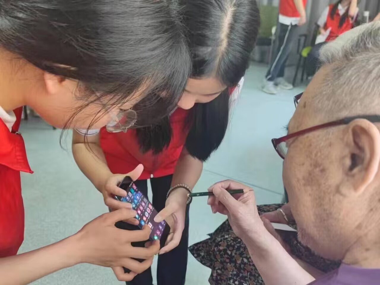 圖為志愿者俯身指導老人操作智能手機 景妮供圖