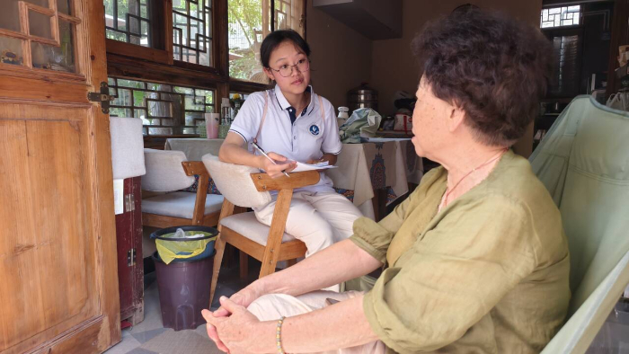 圖為實(shí)踐團(tuán)成員在云山屯民宿與湖南籍老板娘交流地名由來(lái) 朱燕 攝