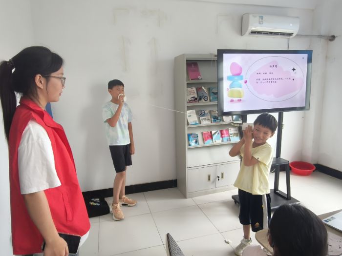 漢字的溫度還在指尖流轉,另一場充滿巧思的實踐體驗已接力登場。實踐成員戚藝嫻帶來的傳聲筒游戲讓課堂笑語不斷。孩子們兩兩分組,手握底線相連的紙杯,凝神傾聽聲響再接力傳遞。簡易道具成了“秘密通道”,默契配合讓消息在課堂流轉;顒雍螅菟噵箍破諅髀曂部茖W原理,告知生活處處皆學問。樸實裝置承載的不僅是物理震動,更是文化接力中滋長的默契與勇氣。