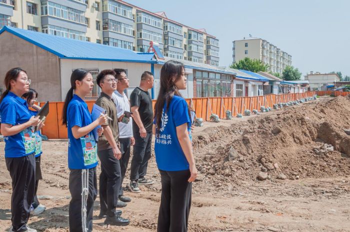 實踐團隊接著前往舊小區管道及停車場改造施工現場,深入作業核心區域考察施工全流程,施工區域呈現出有序的作業態勢。團隊成員從基礎土方開挖、管道安裝敷設,到停車場場地平整及綠化帶規劃,進行系統性調研。