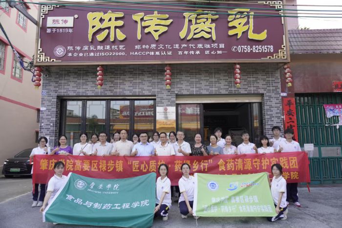 被稱為“廣東老字號”的陳傳腐乳是當地的非遺產業,基于其當下面臨的出口檢測及提升品牌附加值等難題,實踐團特邀肇慶市食品檢驗所專業人員開展專項技術攻關。實地開展前,學院專業老師朱峻霄已經與陳傳腐乳傳承人陳佳和肇慶市食品檢驗所專業人員圍繞腐乳生產中的痛點進行初步溝通,為后續實踐工作找準了方向。7月16日下午,在陳總的帶領下,實踐團成員跟隨學院黨委書記林曉忠、學院黨委副書記肖燕,會同肇慶市食品檢驗所所長張華生及專業技術人員,前往陳傳腐乳生產車間參觀腐乳制作現場并座談討論了蠟樣芽孢桿菌的檢測與腐乳白點的產生防控問題,在談笑間已規劃好產業的下一步走向;在生產車間內,隊員們充滿好奇地張望,了解到一瓶腐乳想要制作完成竟有這么多到工序;檢測實驗室中,隊員們將平日里實驗課所學充分運用,對發酵過程中的鹽分含量等關鍵指標進行精準檢測,為企業優化工藝參數提供數據支撐。在采訪中,陳傳腐乳第六代傳承人陳佳表示:“傳統工藝需要現代科技加持才能走得更遠,雖然一開始有坎坷,但問題在一次次的試錯中已經解決多半,也同樣希望年輕人可以來學習此工藝,讓老手藝傳承下去,助力腐乳產品突破歐盟檢測壁壘。”實踐團成員們未來也將繼續發揮專業優勢,助力陳傳腐乳走向更廣闊的天地,讓非遺技藝在鄉村振興中煥發新活力!