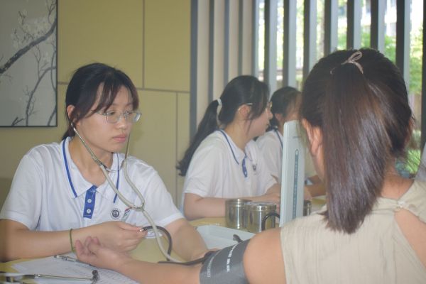 岐黃仁術解民憂:專業服務零距離實踐團甫一抵達,居民們便帶著期待聚攏而來。白大褂雖薄,卻承載著沉甸甸的信任。血壓計袖帶溫柔纏繞臂膀,血糖儀精準讀取數值,志愿者眼神專注,指尖穩定,每一次操作都滲透著對生命的嚴謹與尊重。推拿區域更是“一席難求”。來自中醫、中西醫臨床醫學及康復治療等專業的學生們,指間流淌著苦練而成的力道與技巧。在少荃府社區,年近古稀的張大爺長久困擾于肩頸酸痛,經志愿者一番耐心細致的推拿后,緊鎖的眉頭終于舒展:“這手法真地道!感覺這硬邦邦的肩膀松快多了,像卸下了塊石頭!”那舒緩的喟嘆,是專業技能最真實的回響,更是中醫藥“簡、便、驗、廉”優勢在百姓家門口的生動印證。