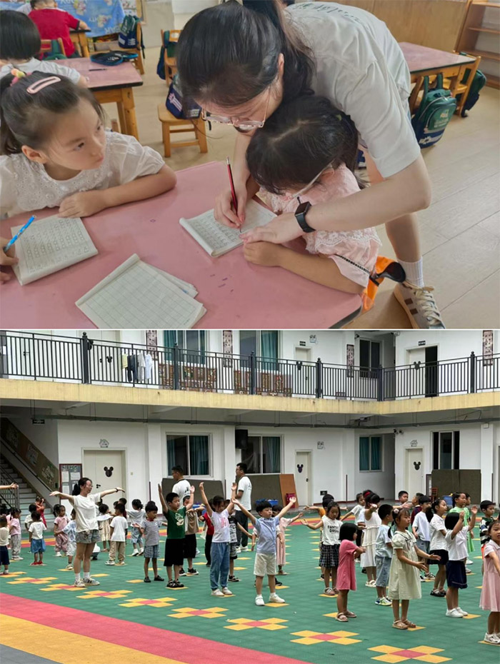 在圣比歐幼兒園,實踐團成員化身為孩子們的“大朋友”,陪伴小班孩子養成良好習慣,教會中班孩子具備基礎認知,輔導大班孩子科學做好入學準備。小班教室里,志愿者們耐心引導孩子們進行“你好再見”禮貌用語情景演練,通過“飯前洗手”健康常識動畫,讓孩子們在歡笑中養成良好的生活習慣;中班課堂上,志愿者們利用“看圖識物配對”“聽句子找玩具”等游戲,激發孩子們的觀察力與專注力,搭配晨間操、戶外追逐跑等活動,讓孩子們在運動中快樂成長;大班課堂通過拼音兒歌、數字卡片游戲、運算符號“找朋友”等趣味活動,為孩子們即將步入小學的學習生活做好充分準備。志愿者們用愛心與耐心,為孩子們編織了一個充滿愛與夢想的暑期時光,贏得了幼兒園師生及家長的一致好評。