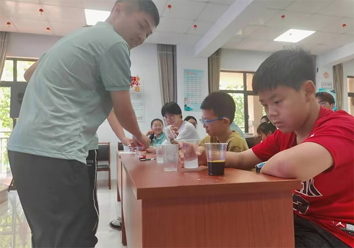 2.“鹽酸除銹”實驗 為什么鐵釘會生銹?”“鹽酸真的能‘吃掉’銹嗎?”帶著這些有趣的問題,科普隊走進府東社區,帶領小朋友們化身“小小化學家”,親手用鹽酸為生銹的鐵釘“煥新”。當銹跡斑斑的鐵釘在鹽酸中逐漸露出金屬光澤時,孩子們瞪大眼睛,發出陣陣驚嘆:“化學太神奇了!”