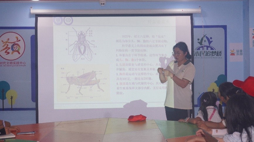 服務(wù)隊(duì)立足專(zhuān)業(yè)優(yōu)勢(shì),在童伴之家開(kāi)設(shè)科普課堂。隊(duì)長(zhǎng)王子潔通過(guò)圖片對(duì)比、互動(dòng)問(wèn)答、模型觀察,生動(dòng)講解昆蟲(chóng)特征與生態(tài)關(guān)系。隊(duì)員們引導(dǎo)兒童觀察形態(tài)細(xì)節(jié),精準(zhǔn)識(shí)別物種差異,激發(fā)科學(xué)興趣。在區(qū)分昆蟲(chóng)與非昆蟲(chóng)時(shí),孩子一句“蜘蛛不是昆蟲(chóng),因?yàn)樗邪藯l腿”的精彩回答,贏得滿堂喝彩。