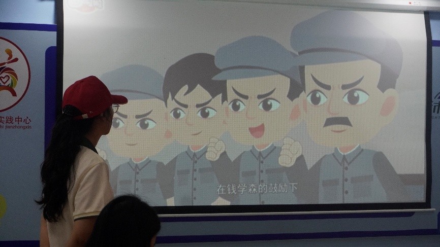 圖為郭振秀在播放錢(qián)學(xué)森有關(guān)的動(dòng)畫(huà)