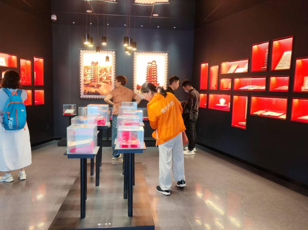 實踐中,團隊成員沿著盤旋樓梯逐層參觀。二層陳列的老照片和繪畫,再現京漢鐵路工人受壓迫與抗爭場景;三、四樓以電影形式,分別呈現二七罷工歷史與鄭州近幾十年發展變遷;五樓是主題郵局和文創店;六樓展出與二七塔相關的文具、勛章等老物件;七樓展示現代鄭州的發展成就……這座塔,是凝固的歷史,也是流動的課堂。講解員向參觀者展示塔內的老照片和罷工介紹,當指尖觸碰展柜中泛黃的罷工宣言,當鐘聲再次在耳邊回蕩,那一刻,課本上的文字化作真實的震撼。團隊成員在講解過程中詢問當時事件的詳細細節,成員們不時拿起紙筆記錄研學筆記,攝影師張翼、周榮波等人不時拍照攝影。二七紀念塔的每一級臺階,都在提醒我們:腳下這片土地,曾有人以生命爭取光明;而今天的我們,亦當以奮斗延續這份信仰。成員訪談二七塔講解員、歷史學者,收集“二七精神”的當代解讀材料,從二七塔底層到最高層,團隊成員依次游覽,從簡單的照片繪畫到用科技電影的場景復原,成員對二七罷工那段歷史有了更深刻的認識。