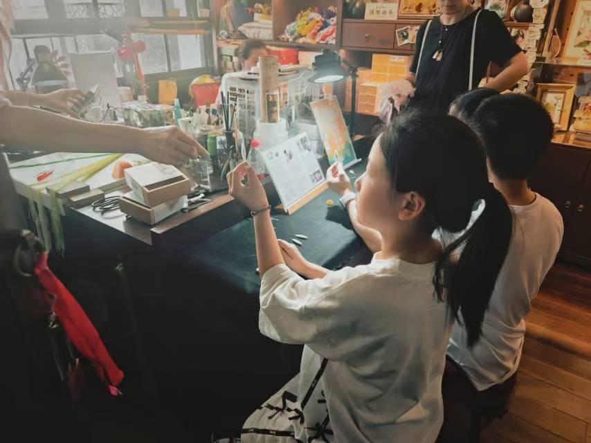 7月9日,二隊(duì)前往南京絨花制作工坊,欣賞展柜里展示的令人驚艷的成品。隊(duì)員們記下了絨花制作的基本步驟,同時(shí)看到這些看似柔軟的絨絲,在師傅的巧手下逐漸變成立體的花朵。