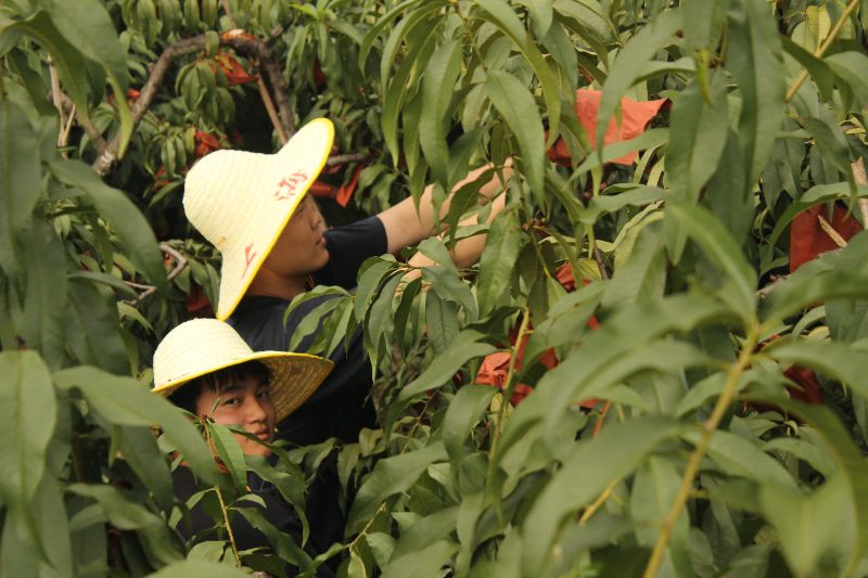 炎陵黃桃作為國家地理標志產品,是當地鄉村振興的“黃金果實”。實踐團首站來到中村瑤族鄉黃桃種植基地,漫山遍野的桃樹下,果農們正忙著疏果、套袋。“今年雨水適中,掛果率比去年高了近兩成,但得提防后期臺風影響。”實踐團成員們拿起農具,體驗疏果流程,在勞作中感受果農的辛勤付出,詳細記錄下種植環節的成本投入、技術需求與收益情況。