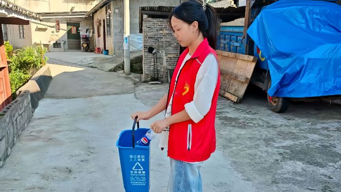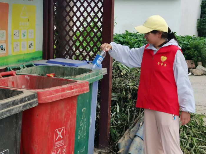 圖為實踐團成員楊彩綾手持可回收物垃圾桶,分類投放塑料瓶。楊彩綾 供圖