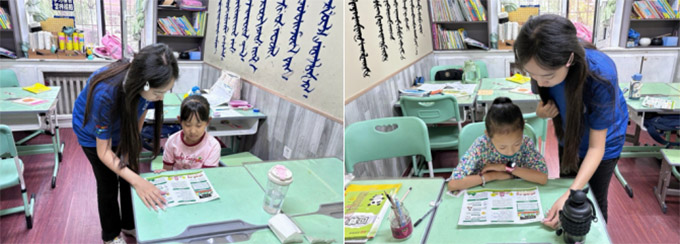 針對調研結果,團隊創新設計“童聲同語課堂”和“青春夜校”等沉浸式活動。在內蒙古包頭市昆都侖區鋼37社區,“國旗下的普通話”晨讀班利用童謠、繪本、情景劇等形式,幫助學齡兒童矯正發音、規范用語。夜幕降臨,墨玉縣喀爾賽鎮的“青春夜校”普通話公益班則聚焦“日常交流、就醫問藥、集市買賣、手機支付”四大生活場景,通過“一對一”糾音、“情景模擬”對話和“字詞闖關”游戲,讓少數民族群眾在家門口輕松學習實用普通話。活動照片顯示隊員在晨讀班教學。