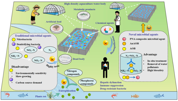 而部分亞硝化-厭氧氨氧化(partialnitrificationandanammox,PNA)技術(shù),恰如一把精準(zhǔn)的鑰匙。這項(xiàng)新型生物脫氮工藝有著巧妙的“兩步法”:先由氨氧化菌(AOB)上陣,將約54%的進(jìn)水氨氮(NH4+-N)轉(zhuǎn)化為亞硝酸鹽氮(NO2--N);再換厭氧氨氧化菌(AnAOB)接力,在厭氧環(huán)境中“吃掉”剩余的氨氮與生成的亞硝酸鹽,最終實(shí)現(xiàn)高效脫氮。指導(dǎo)老師團(tuán)隊(duì)創(chuàng)新提出“原位凈化”方案——往塘里投加復(fù)合菌劑,讓污染物在“家門(mén)口”就被降解。比起傳統(tǒng)方式,它省下了額外設(shè)備的開(kāi)銷(xiāo),還能降本增效,尤其對(duì)中小型養(yǎng)殖戶(hù)來(lái)說(shuō),堪稱(chēng)貼心的技術(shù)福音。