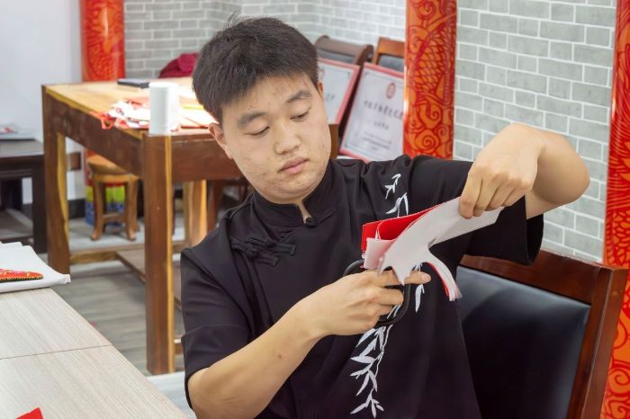 最精彩的環節當屬劉老師的剪紙現場展示。只見他手持剪刀,在紅紙上快速剪裁,不到五分鐘,一組栩栩如生的蝴蝶便躍然紙上。翅膀紋路細膩,觸須纖毫畢現,讓同學們驚嘆不已。在劉老師指導下,同學們也嘗試剪紙創作,雖然作品粗糙,但收獲滿滿。