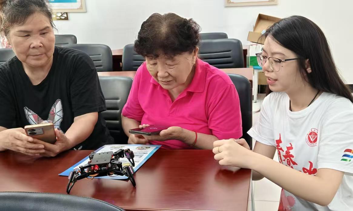 圖為四足機(jī)器人興趣組成員向老人展示和指導(dǎo)老人操作四足機(jī)器人。潘永旺攝