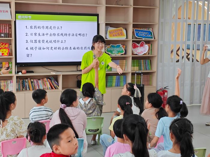 綠意潤童心:環保科普啟蒙課堂 實現綠色農業需要一代代人的不懈努力。實踐團成員走進可戀莊村彩虹部落,開展果蔬農殘凈化小課堂,為小朋友們科普農殘的相關知識。課堂以“紫甘藍指示劑變色實驗”導入,通過“滴一滴、看一看、比一比”的互動環節,引導兒童直觀理解酸堿變化及農殘來源。孩子們在指導下親手操作農殘速測儀,神奇演示效果瞬間點燃了孩子們的好奇心,也讓他們對學習去除農殘方法產生了濃厚的興趣,讓環保理念和農殘意識在孩子們心中生根發芽。