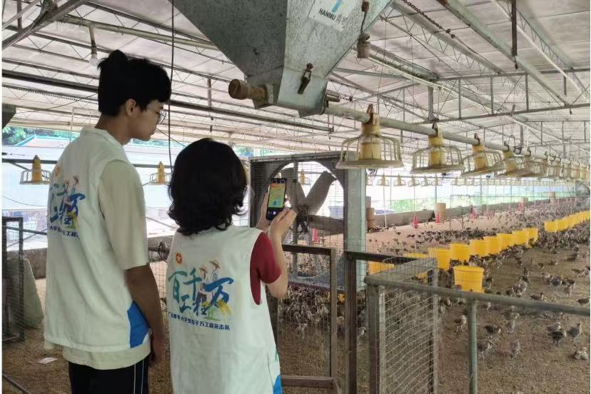 緊接著,實踐團轉赴欖根村黃塘家庭農場開展深度調研。該農場采用"公司+農戶"模式養殖麻黃雞、貴妃雞、烏骨雞三類特色雞種。通過現場訪談養殖戶,團隊系統采集關鍵數據。